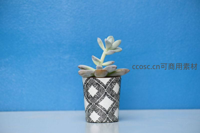 一株淡绿色多肉安静地置于黑白几何图案的花盆中,纯净的蓝色背景衬托出其简约而富有设计感的美感。