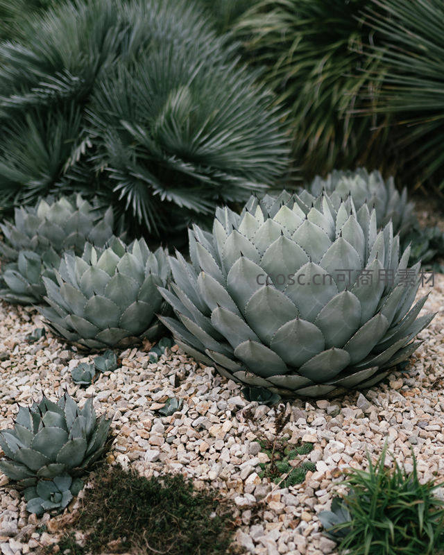 几株大型龙舌兰在碎石铺就的庭院中舒展生长,叶片如剑般锐利,背景是茂密的棕榈类植物,营造出静谧而充满野性的沙漠风情。
