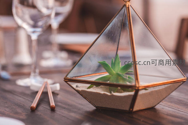 一个铜框玻璃金字塔容器内种植着小巧多肉,底部铺满细沙,置于木质餐桌之上,旁有酒杯与筷子,营造温馨雅致的用餐氛围。