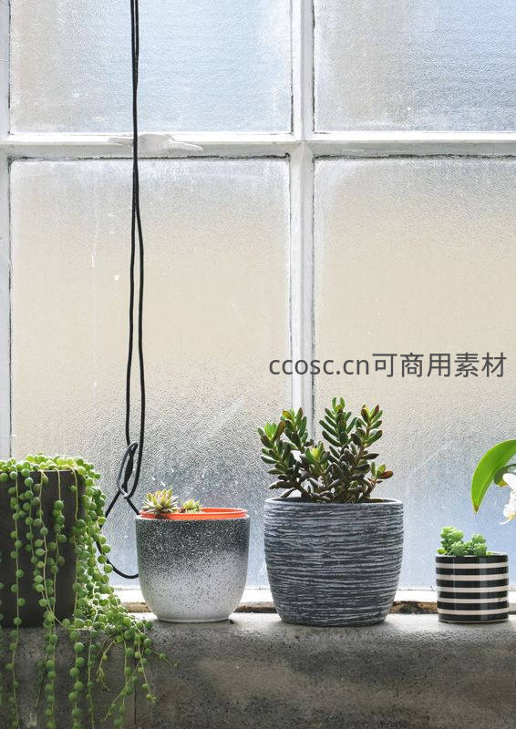几盆形态各异的多肉植物错落摆放在窗台上,透过磨砂玻璃洒下柔和光线,营造出温馨宁静的居家氛围,展现生活中的自然美学。