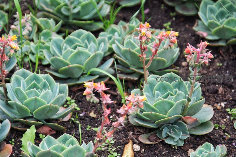 几株多肉在庭院泥土中静静生长,抽出粉黄相间的花穗迎风摇曳,周围绿叶层叠,展现自然生态中植物繁衍的生命力与和谐之美。
