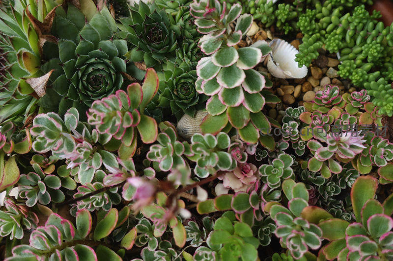 多种形态与色彩的多肉植物紧密排列,叶片边缘泛着粉红,搭配小石子与贝壳,营造出精致迷你花园的视觉效果。