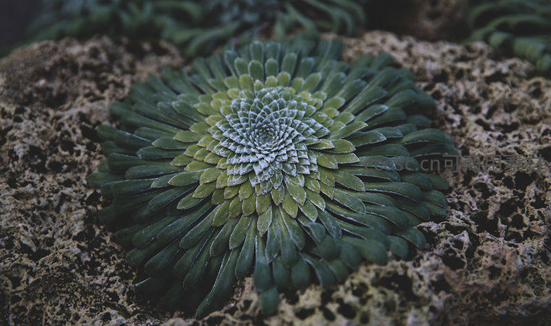 一株呈完美螺旋结构的多肉植物生长在粗糙的火山岩缝隙中,叶片层层叠叠,表面覆有细微白霜,展现出自然的生命力与美感。