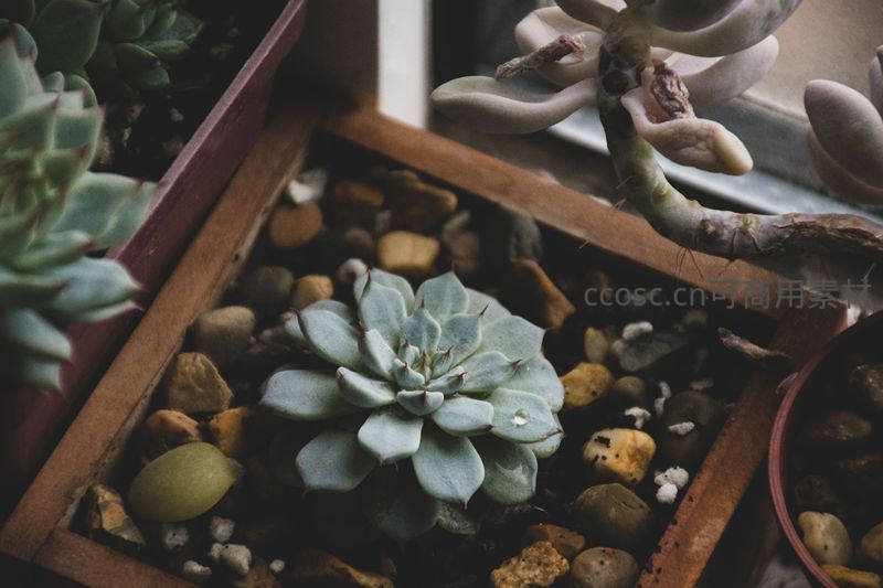 一株形态优美的多肉植物栽种在质朴的木质花盆中,周围铺满小石子,展现出宁静自然的家居装饰美感。