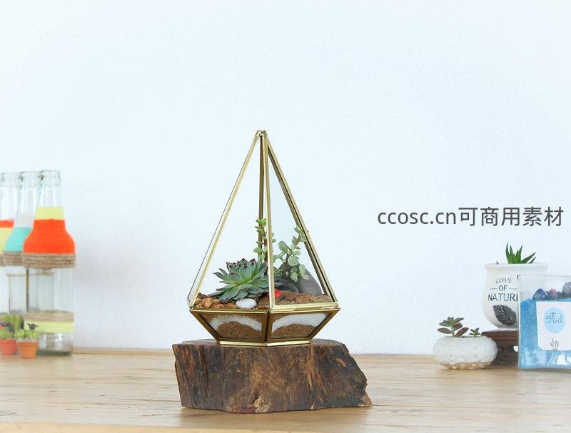 金色边框的几何形玻璃罩内,多肉与砂石构成迷你生态,置于原木底座上,为现代家居空间增添一抹文艺与自然气息。