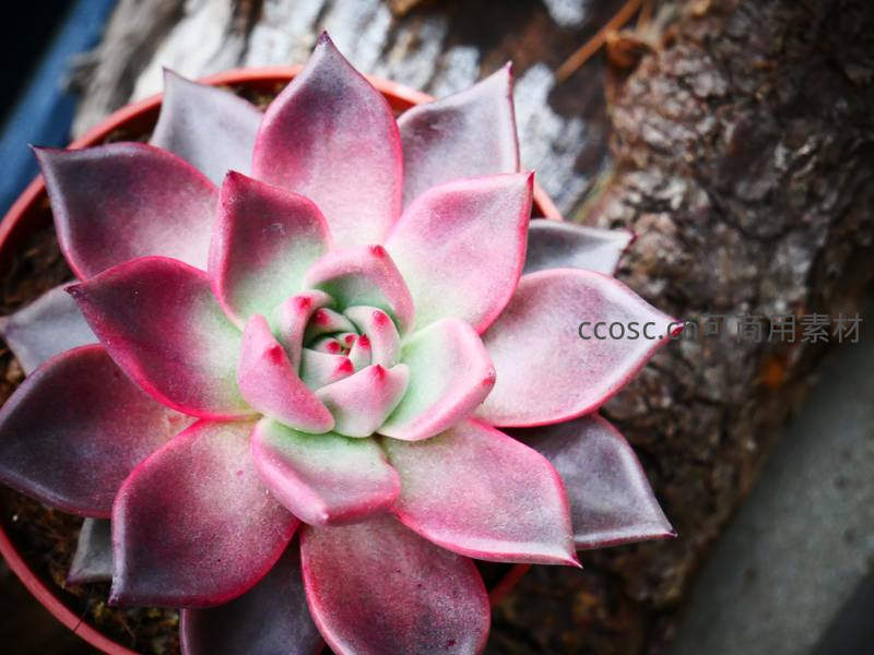 镜头拉近,一株粉紫渐变色的多肉植物层层叠叠的叶片清晰可见,其精致的纹理和色彩如同盛开的花朵般迷人。