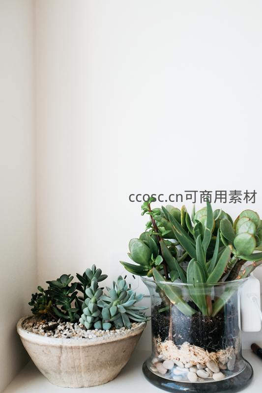 一盆陶土盆和一个玻璃瓶中分别种植着不同品种的多肉,安静地摆放在窗台角落,享受着柔和的自然光,充满生活气息。