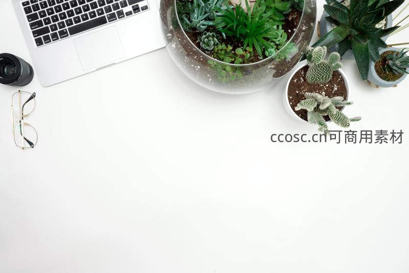 纯白桌面上摆放着笔记本电脑、眼镜和多个精致多肉盆栽,构图简洁有序,既体现现代办公的高效,又增添一抹自然绿意,激发工作灵感。