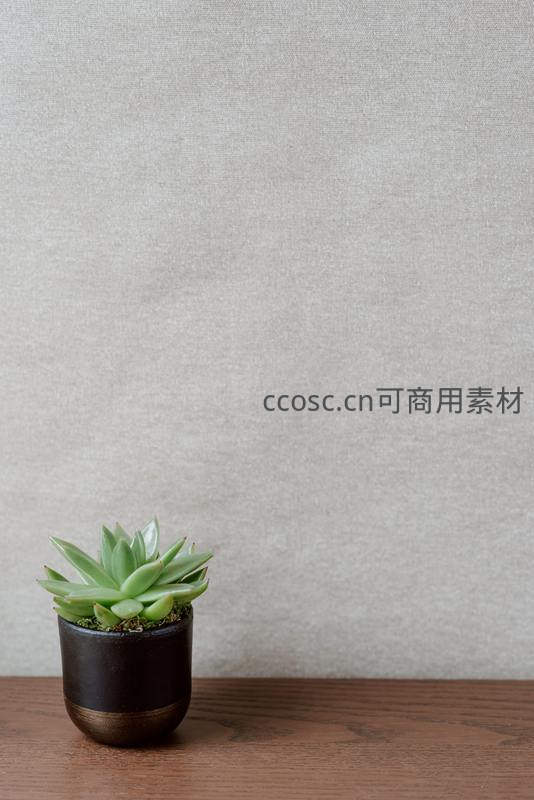 一盆小巧多肉安静地放在木质桌面上,简洁的灰色背景突显其自然形态,整体画面干净利落,富有设计感。