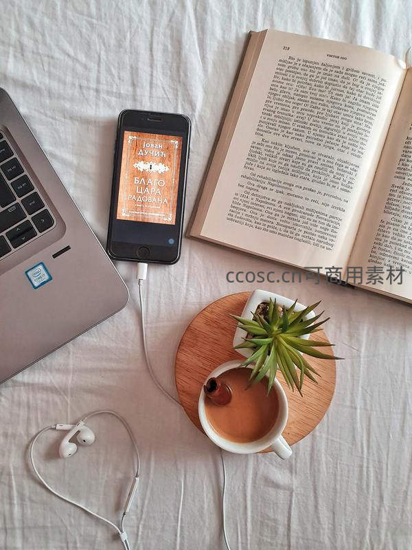 一张铺着白色床单的床上,摊开着一本实体书,旁边是正在播放电子书的手机、一杯咖啡和一盆小多肉,营造出惬意悠闲的居家阅读氛围。