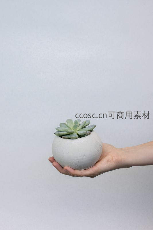 一只纤细的手掌轻轻托举着一个灰白色水泥质感的小花盆,盆中是一株淡绿色的莲座状多肉,背景纯净,传递出温柔、治愈与呵护的情感。