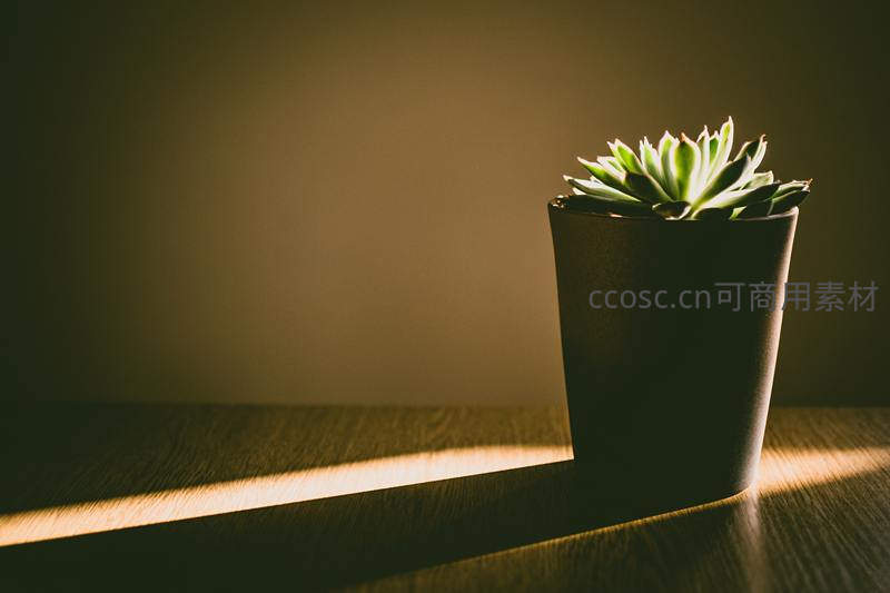 一盆多肉植物安静地立于木质桌面上,斜射的金色阳光勾勒出其轮廓与阴影,营造出温暖、宁静且富有诗意的午后时光氛围。