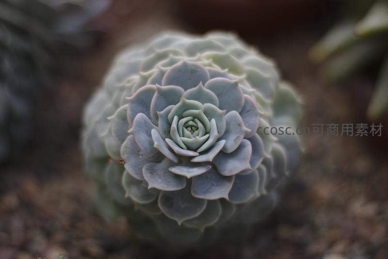 特写镜头捕捉一株蓝灰色多肉植物,其叶片呈完美螺旋排列,层次分明,展现出自然界的几何艺术与静谧生命力。