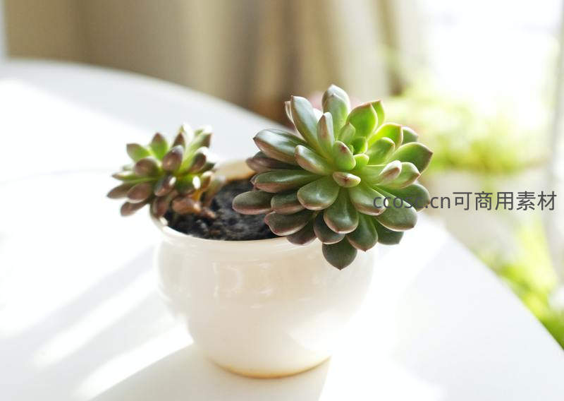 两株小巧多肉安静地置于白色陶瓷花盆中,沐浴在窗边洒落的光斑里,画面简洁而富有生活气息,令人感到放松。
