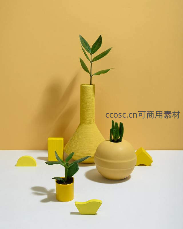 多种黄色调的几何容器与绿植巧妙搭配,在暖黄色背景和白色台面上构成一幅充满设计感的静物画面,温馨又时尚。