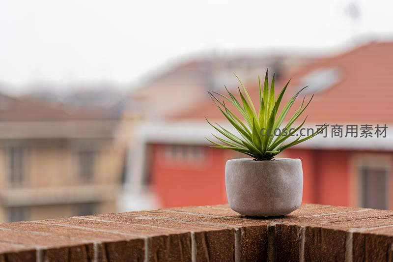 一株小巧的绿色多肉植物静置于红砖阳台栏杆上,背景是模糊的城市建筑群,营造出宁静与都市并存的诗意生活画面。