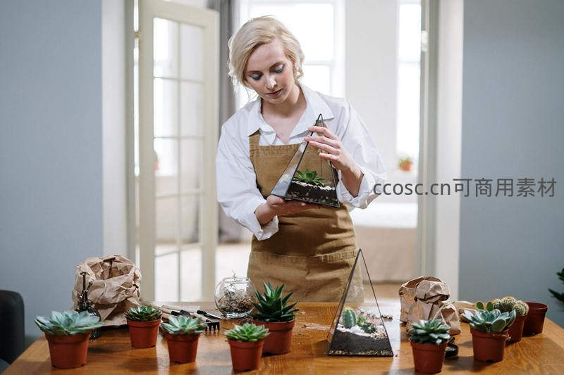 女子手持一个装有多肉的三角形玻璃生态瓶,桌上摆满各类盆栽,体现精致的手工园艺生活。