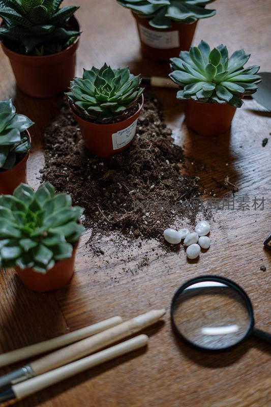 俯拍视角下,木桌上散落着多肉盆栽、泥土、放大镜和园艺笔,呈现充满细节感的种植准备场景。