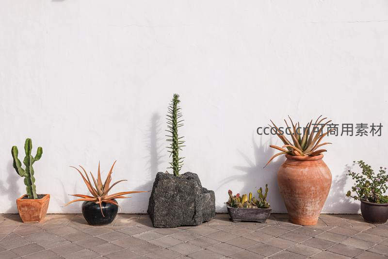 在洁白墙壁前,不同造型的多肉与仙人掌被巧妙布置于各色花器中,构成富有设计感的庭院景观。