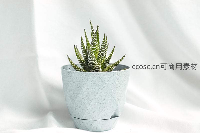 一盆叶片带银白条纹的十二卷多肉植物,种植于浅蓝色斑点纹理花盆中,背景是洁白垂坠的布料,整体画面干净明亮,充满生活气息。