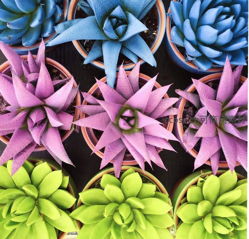 从正上方俯瞰,多种色彩鲜艳的多肉植物整齐排列在陶盆中,包括亮绿、梦幻紫和科技蓝等品种,展现出丰富的纹理与视觉冲击力。
