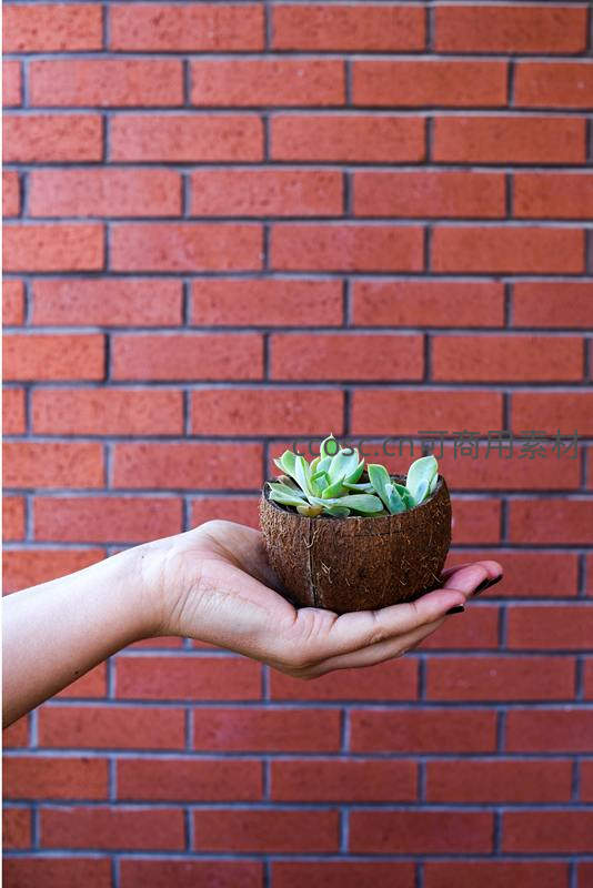 一只手轻柔地托着一个用椰子壳制成的天然花盆,里面种着翠绿的多肉,背景是复古的红砖墙,形成鲜明色彩对比。