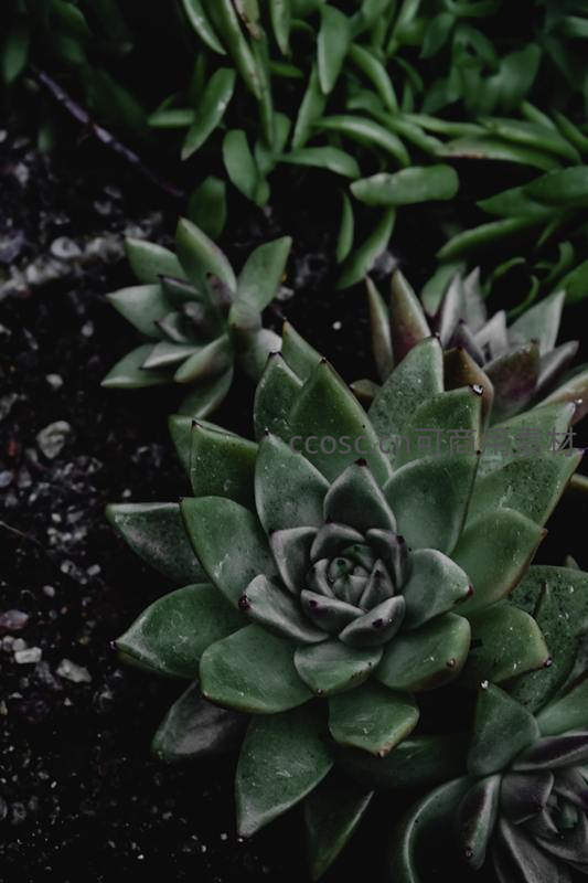 在深色土壤和背景的衬托下,一株绿色多肉植物的叶片层次分明,边缘略带暗色,展现出自然生长的原始美感与质感。