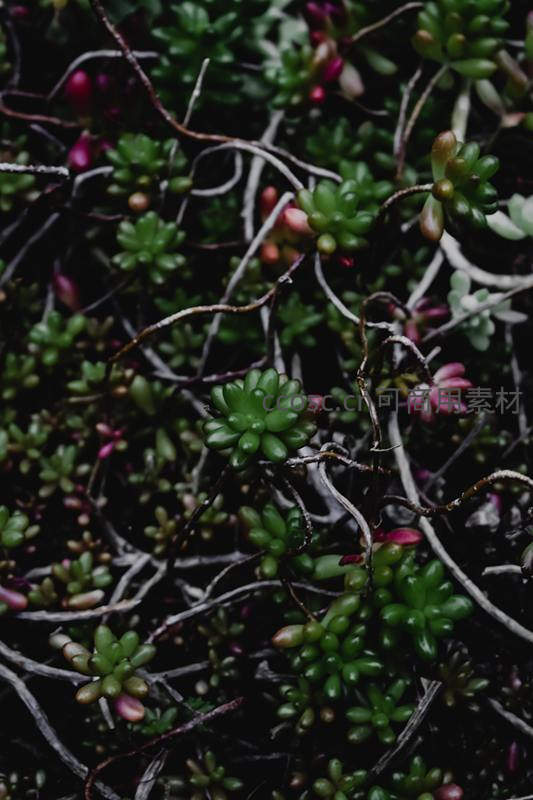 细密的枯枝与鲜活的绿色多肉交织在一起,部分叶片泛着紫红色,构成一幅充满野趣与生命力的自然微观景象。