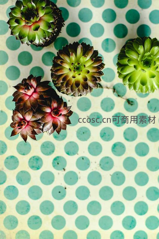 从上方俯瞰四株色彩各异的多肉植物散落于复古波点背景之上,构图活泼,充满生活气息与装饰艺术感。