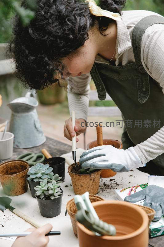一位卷发女性在户外专注地为多肉植物换盆,周围摆放着各种花盆和园艺工具,展现宁静而充满生机的生活场景。