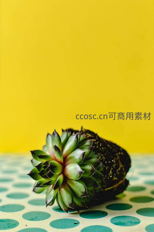 一株带根黑土的多肉植物置于明黄色背景前,搭配青绿色波点台面,构图简洁,色彩对比鲜明,富有现代艺术感。