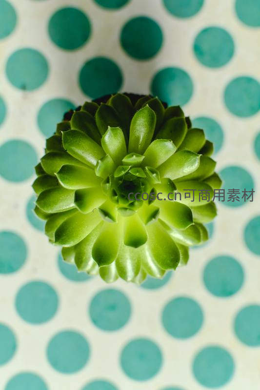从正上方拍摄一株饱满的绿色多肉,层层叠叠的叶片构成完美螺旋,背景是蓝白波点图案,凸显其自然几何之美。