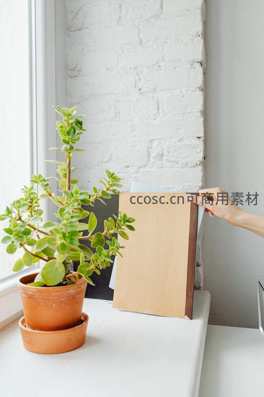 白色窗台上摆放着一盆绿意盎然的多肉,旁边是正在翻阅的书籍,背景为白色砖墙,营造出宁静、文艺且充满生活气息的阅读角落。