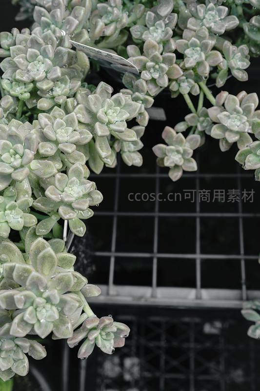 灰绿色多肉植物的叶片上挂满晶莹水珠,在柔和光线下显得格外清新动人,背景黑色网格衬托出植物的柔美与生命力,适合作为家居装饰或摄影素材。