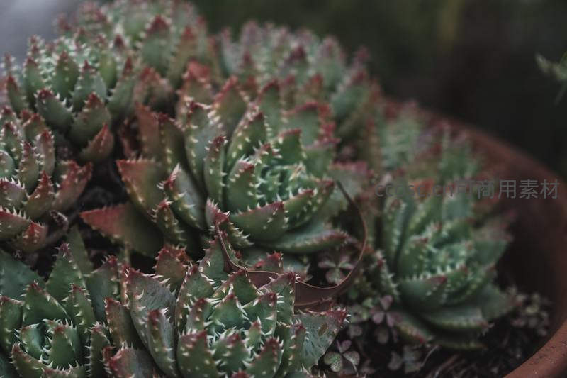 镜头聚焦于一簇形态独特的多肉植物,其叶片边缘布满细密尖刺,叶色由绿渐变至红褐色,在柔和光线下展现出丰富的质感与生命力。