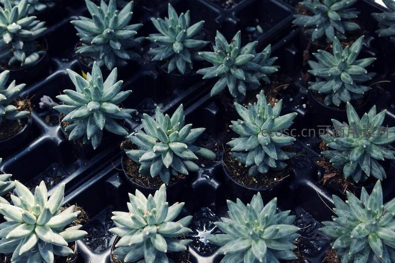 多个小型多肉幼苗整齐地排列在黑色塑料育苗盘中,每株叶片呈淡蓝绿色,形态规整,展现了规模化种植与园艺生产的有序场景。