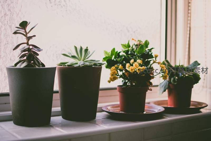 几盆形态各异的多肉植物静静摆放在窗台上,沐浴在柔和的自然光下,营造出温馨宁静的居家氛围。