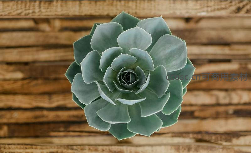 俯拍视角下,一株造型优美的蓝绿色多肉植物置于温暖木质背景前,叶片层层叠叠,充满自然的艺术美感。