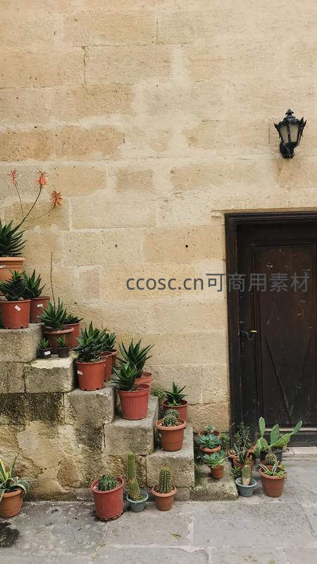 阳光洒在古老的石墙和阶梯上,各色多肉植物错落有致地摆放在陶盆中,与深色木门相映成趣,充满田园诗意。