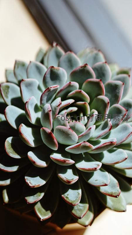 镜头聚焦于一株叶片边缘泛红、中心呈蓝绿色的多肉植物,层叠如花,阳光勾勒出清晰轮廓,展现细腻自然之美。