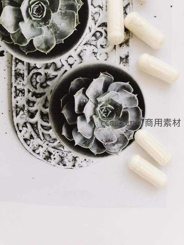 采用黑白摄影手法,将形态优美的多肉植物与白色胶囊并置,营造出强烈的视觉对比和艺术氛围。
