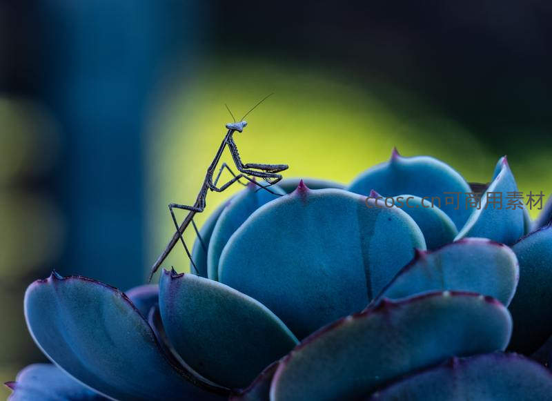 一只纤细的螳螂优雅地立在一片蓝紫色的多肉叶片上,背景虚化,突显了昆虫与植物间的微妙生态关系。