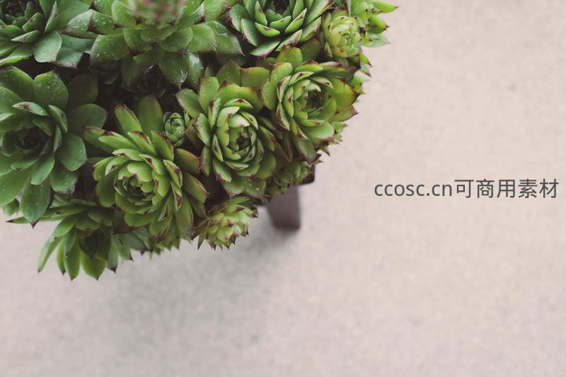 从上方俯瞰一簇紧密生长的多肉植物,叶片层层叠叠,色彩鲜绿带红边,搭配素色背景,呈现清新自然的装饰性构图。