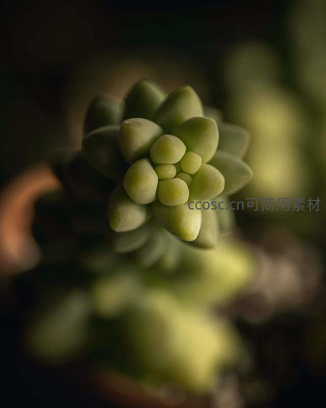 柔和光线下,一株嫩绿色多肉的花苞在虚化背景中若隐若现,营造出宁静而富有诗意的视觉氛围。