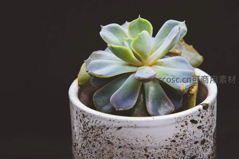 一株叶片呈蓝灰色的多肉植物,被精心栽种在带有黑色斑点的白色陶瓷盆中,色彩与质感形成优雅对比。