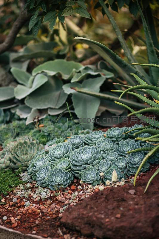 多种多肉植物在花园一角形成自然群落,搭配红土与碎石,背景是其他绿植,构成一幅充满野趣与生态美感的自然景观。