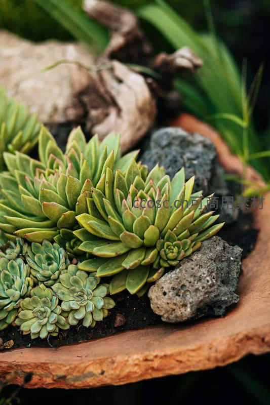 形态各异的多肉植物与深色火山石共同置于粗陶盆中,形成强烈的视觉对比,展现了自然元素的和谐搭配与质朴美感。