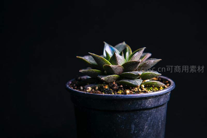 一株形态独特的多肉植物被置于深色花盆中,在纯黑色背景的强烈对比下,叶片的轮廓与纹理清晰可见,光影交错间散发出沉静而高级的艺术气息。