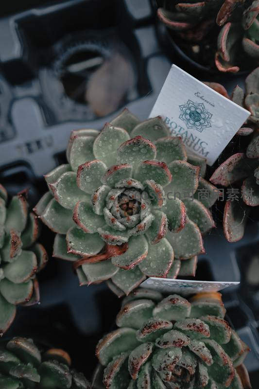 多肉植物特写,叶片晶莹带露珠