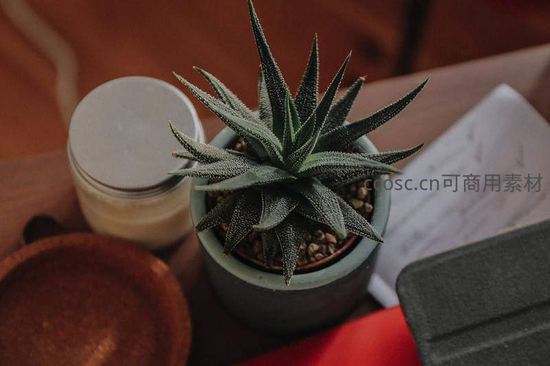 一盆形态独特的多肉植物摆放在木质桌面上,周围环绕着日常用品,营造出宁静舒适的居家氛围。